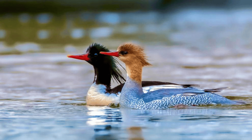中华秋沙鸭:国家一级保护动物、全球极危物种,被誉为 “鸟中活化石”。体长约49-63厘米,雄鸟头顶具深绿色金属光泽,眼后有白色斑,胁部羽毛呈鱼鳞状黑白相间;雌鸟头顶棕褐色,腹部白色。