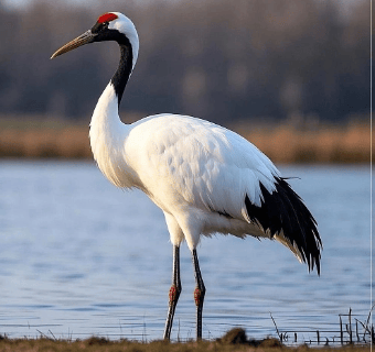 丹顶鹤:国家一级保护动物,体长约1.5米,通体洁白如雪,头顶一抹朱红是其标志性特征,喙长而直,双腿纤细修长,飞行时双翼展开如白色帆影。秋冬季节(11月-次年2月)最易观测,常集群栖息于黄河大坝沿线滩涂、黄河口生态旅游区。