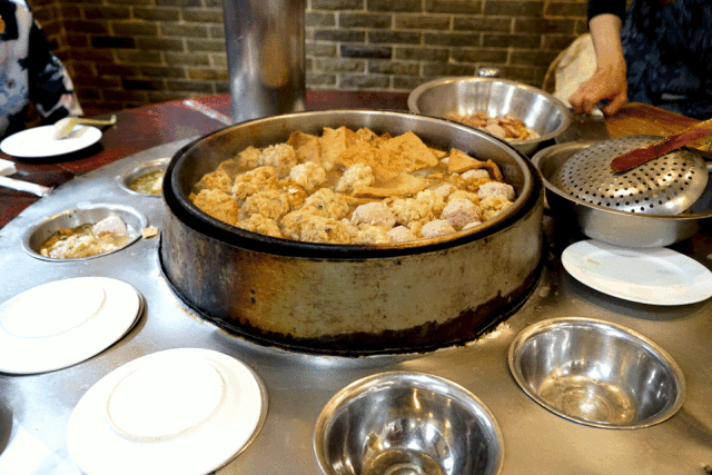 一群人围着圆桌就座,中间一口大锅四溢着热气,锅里头正在咕嘟咕嘟翻滚的汤水中满是炸豆腐、肥肠、丸子,煮锅师傅眼疾手快地捞出煮到恰到好处的美味,盛入你的碗中。