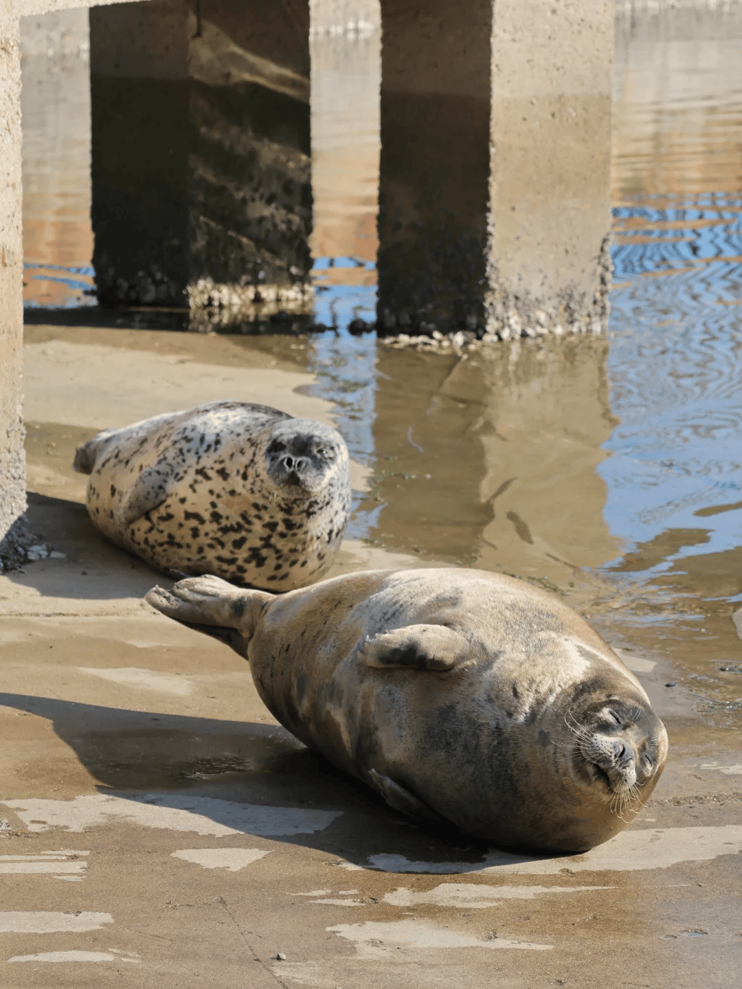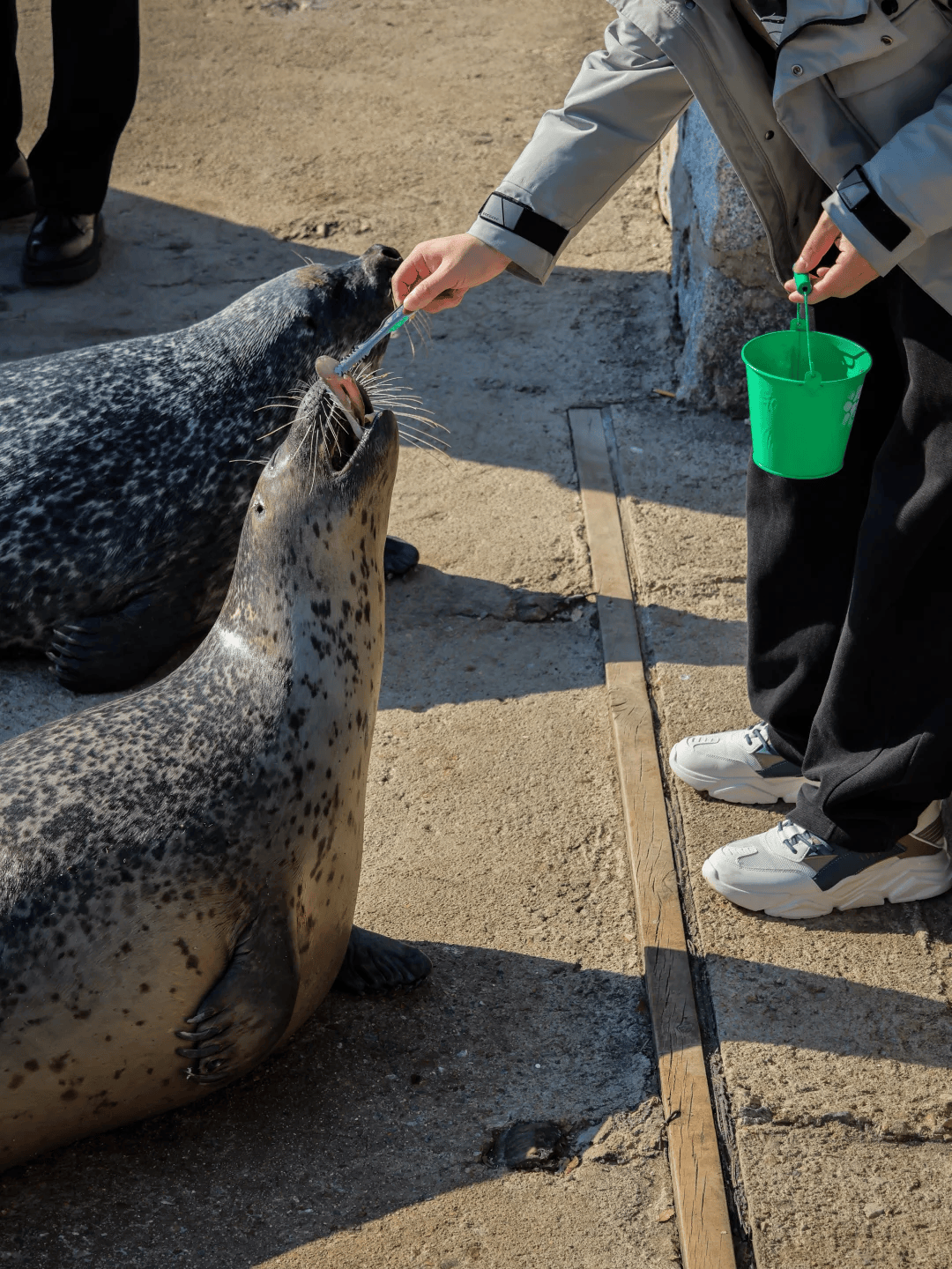 第一站,直冲东炮台海豹湾生态保育公园,看一群圆滚滚、毛茸茸的小海豹,撒娇翻滚、拍水花……萌到心化,还能亲手喂海豹~