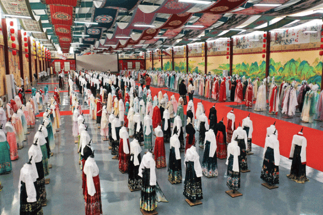 想知道一件汉服是如何从布料变成成衣的?就来有爱云仓汉服基地!有爱云仓是曹县最早的汉服基地,展厅里有5000平方米的场地,摆放着近4000款汉服,在展厅,各式各样的马面裙格外引人注意。
