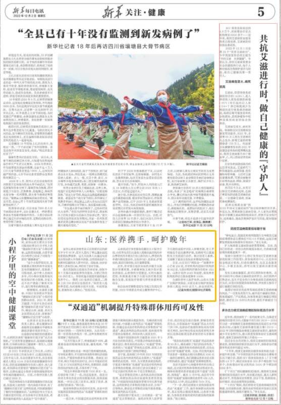 12月2日,《新华每日电讯》以《山东:医养携手,呵护晚年》为题,点赞山东养老服务建设工作。目前,山东实行“两院合一”的康养中心已有258家,养老机构内设医疗机构的有852家,与医疗机构开展合作的有1521家。山东计划在2025年底前,实现养老机构医养结合服务覆盖率100%。全文如下: